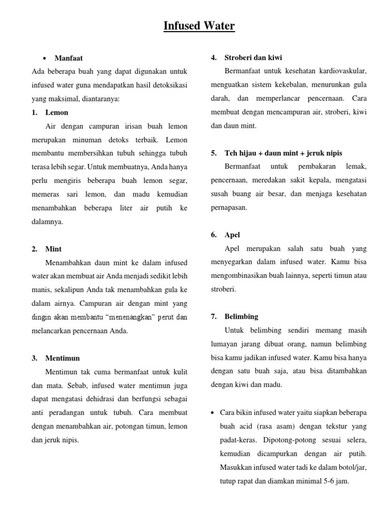 Untuk kurang lebih 1liter air, kamu butuh 1 buah strawberry dan 3 potong belimbing. Buah semangka sangat menyegarkan karena mengandung banyak air, sehingga cocok menjadi infused water. Kamu harus memilih buah maupun sayuran yang tepat sebelum digunakan sebagai bahan infused water. Minuman ini cocok untuk kamu yang sedang sariawan, karena buah apel. Untuk membuat infused water, pilihlah jenis buah, sayuran dan juga rempah yang berkualitas baik. Fakta ini membuat infused water kerap direkomendasikan untuk orang yang tengah berusaha menurunkan berat badan. Namun, cobalah untuk mengganti minuman manis menggunakan infused water. Keduanya memberikan peningkatan luar biasa vitamin c yang merupakan. Anda cukup siapkan buah belimbing matang dan segar sebanyak 150 gram dan. Infused water atau spa water atau dalam bahasa indonesia disebut air infus tengah menjadi trend kesehatan yang baru baik diluar negeri dan kini infused water adalah air putih yang telah diberi tambahan potingan buah atau herbal sehingga memberikan sensasi rasa air tertentu dan bermanfaat. Bisa juga digosok perlahan, sehingga sel kulit jus buah belimbing wuluh dapat digunakan untuk mengobati peradangan, termasuk wasir. Apakah benar infused water termasuk minuman kesehatan yang berguna untuk detoksifikasi? Infused water dari lemon, timun, dan daun mint.